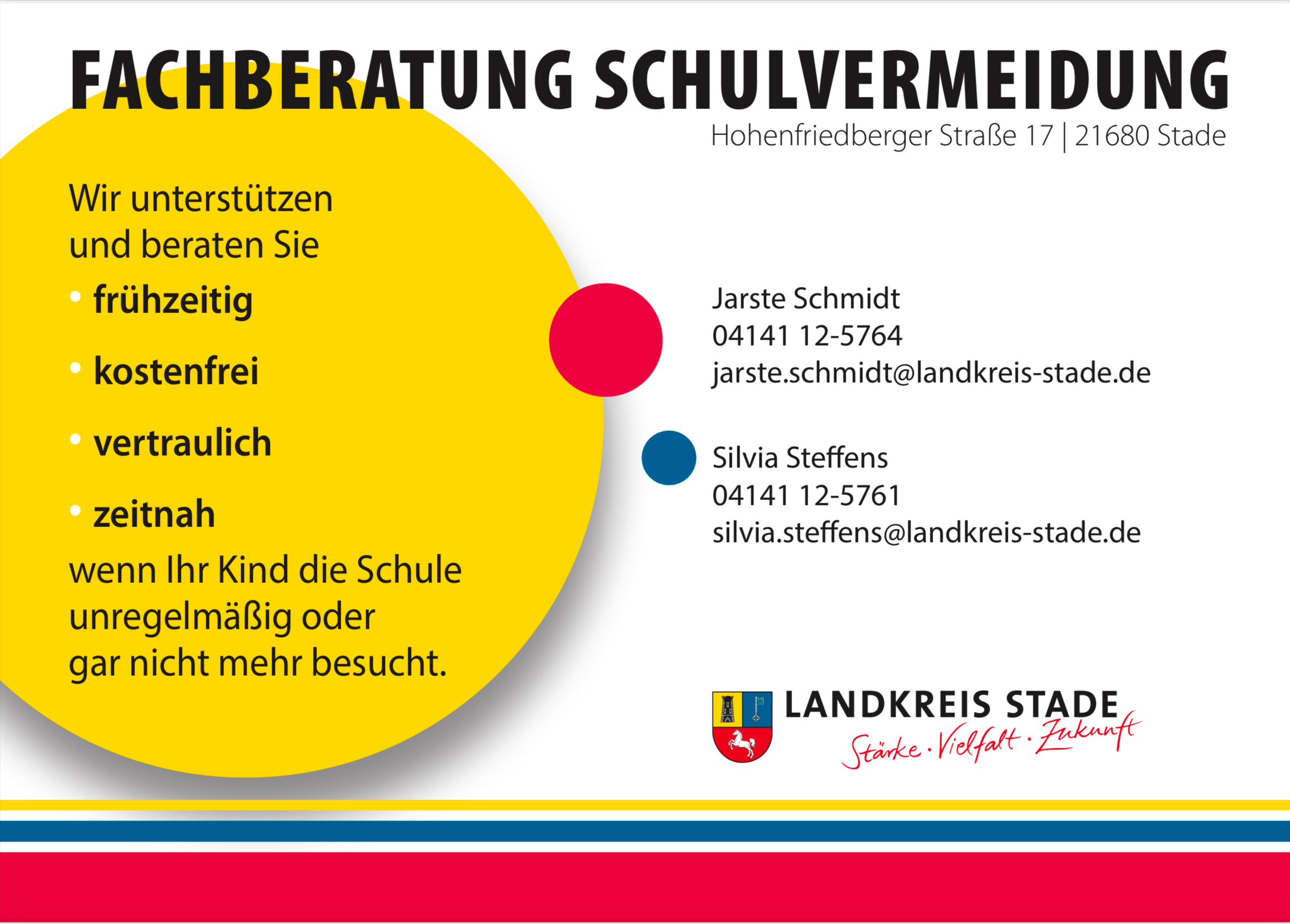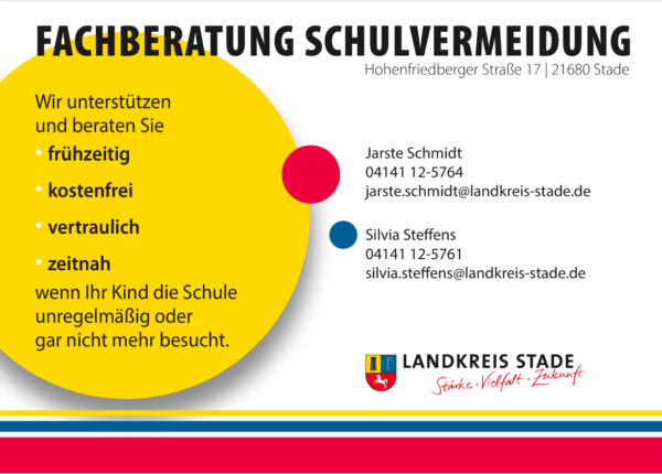 Die Fachberatung Schulvermeidung des Jugendamtes, Landkreis Stade, möchte Ihnen heute die digitale Postkarte der Beratungsstelle vorstellen. Sollten auch Sie und Ihr Kind davon betroffen sein, nehmen Sie gern dieses Beratungsangebot an und suchen Sie gemeinsam nach Lösungen für eine gesicherte Zukunft.