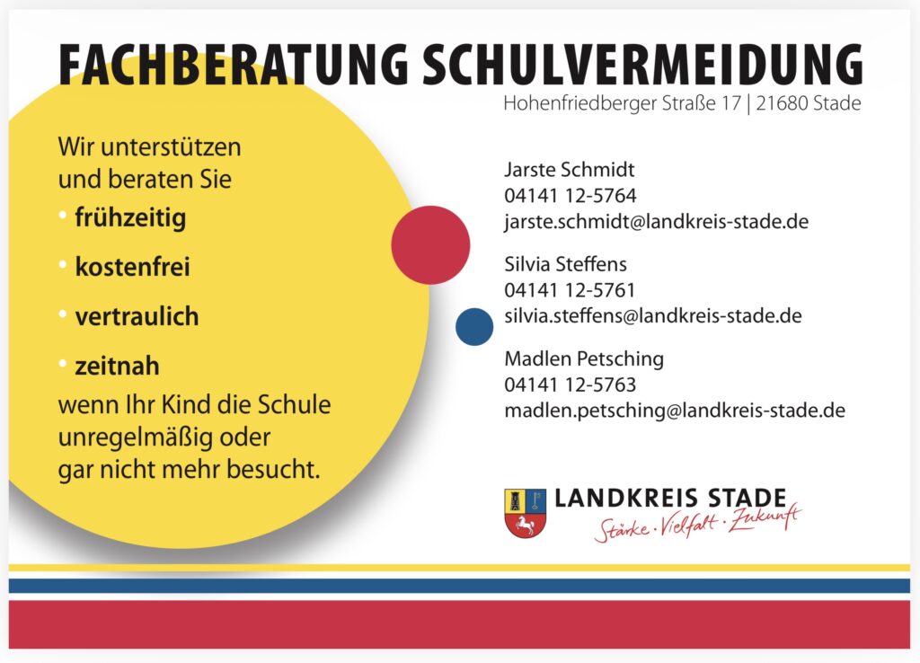 Die Fachberatung Schulvermeidung des Jugendamtes, Landkreis Stade, möchte Ihnen heute die digitale Postkarte der Beratungsstelle vorstellen. Sollten auch Sie und Ihr Kind davon betroffen sein, nehmen Sie gern dieses Beratungsangebot an und suchen Sie gemeinsam nach Lösungen für eine gesicherte Zukunft. Bildquelle: Landkreis Stade