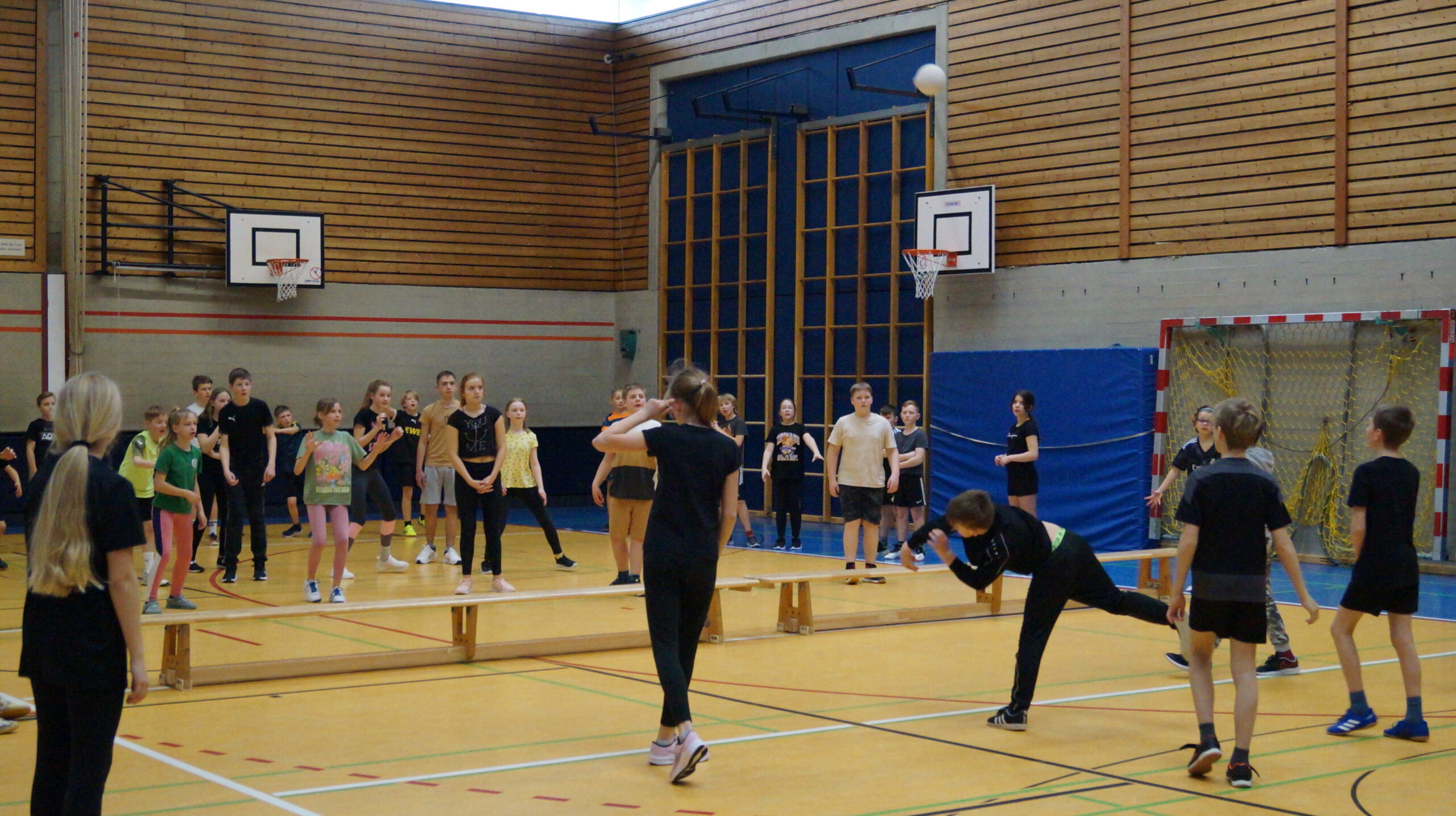 Im Jahrgang 5 und 6 hat jeder gegen jeden traditionell Völkerball gespielt – es waren somit 8 Mannschaften. Die Stimmung und Motivation war super! Es wurde angefeuert, sich gefreut und geärgert;-) Die Schüler des WPK Sports (Schüler der 9. und 10.Klassen haben unterstützt als Schiris – das haben sie richtig gut gemacht!