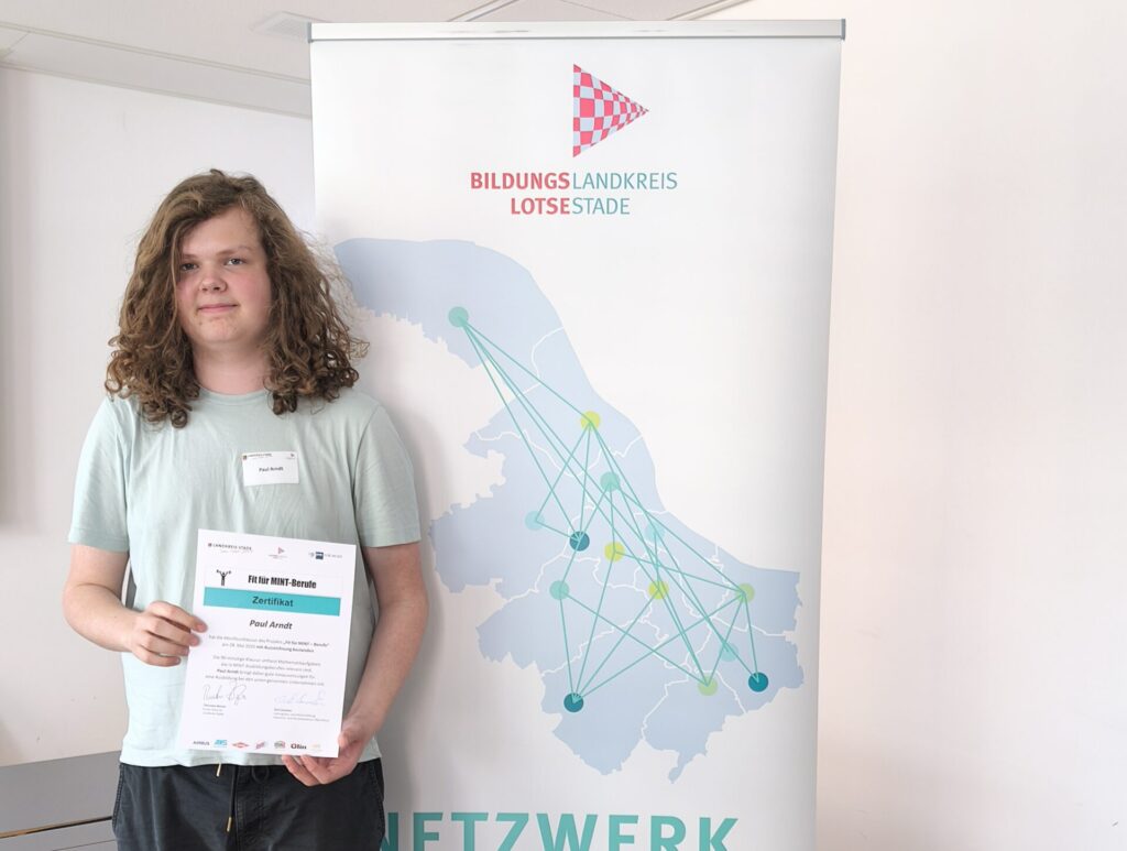 Jedes Jahr nehmen einige 9. und 10. Klässer der Selma-Lagerlöf-Oberschule an der 90-minütigen MINT-Abschlussklausur für Mathematik in Stade teil. Dieses Jahr hat Paul Arndt (10. Klasse) am 17.06.2025 ein Zertifikat mit Auszeichnung erhalten sowie ein Praktikum in einer bekannten Firma und eine Musikbox gewonnen. Das Zertifikat mit Auszeichnung erhält man